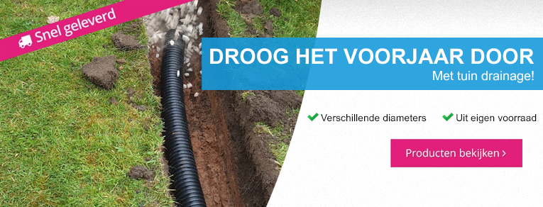 Heb je in de tuin rond je woning of op het weiland wateroverlast? Dan kan het aanleggen van een drainagebuis de oplossing zijn! Op deze manier wordt overtollig water uit de bodem afgevoerd. Als je drainage wilt aanleggen in bijvoorbeeld de tuin, bouwkavel, kruipruimte, paardrijbak of weiland, ben je bij Drainagebuizen.nl aan het juiste adres. Wij hebben een bijzonder uitgebreid aanbod drainagebuizen, zodat je in ons assortiment ongetwijfeld een geschikte drainagebuis vindt die perfect aansluit bij jouw wensen!